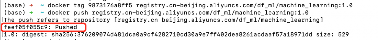 $ docker push registry.cn-beijing.aliyuncs.com/df_ml/machine_learning:[镜像版本号]如: