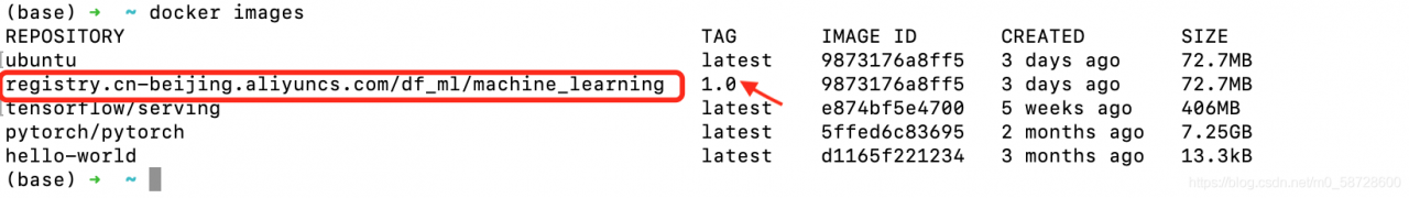 $ docker tag 9873176a8ff5 registry.cn-beijing.aliyuncs.com/df_ml/machine_learning:1.0