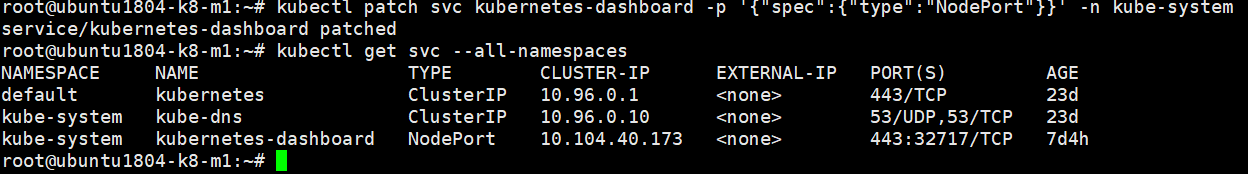 #也可以用一条命令来执行: kubectl patch svc kubernetes-dashboard -p '{"spec":{"type":"NodePort"}}' -n kube-system