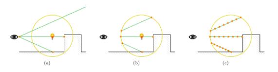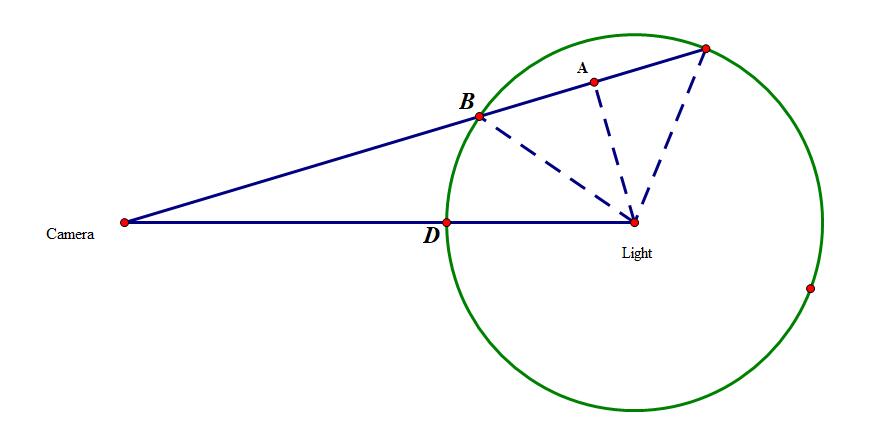 我们从最简单并具有代表性的一种情况入手,即当相机在点光源范围外的时候,效果如上图所示,通过绘制一个和点光源范围一样的球,通过raytrace的方法遍历球中的位置并计算其光照,raytrace 路径如图所示,我们只需要遍历光线在球内部的位置: