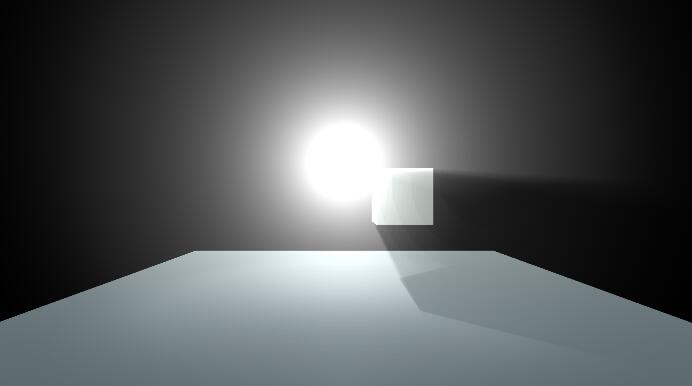然后是散射,我们之所以能看见“体积光”就是因为光线在介质中发生了散射,在点光源中,我们可以简单的设置一个系数来决定raytrace的每一步有多少光源散射到了摄像机方向,到了这一步,我们便可以得到下面的结果: