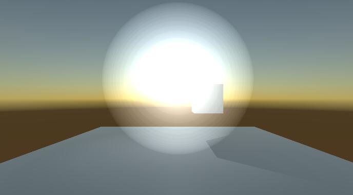 图中的结果是直接在光源位置放置了一个等大小的 Sphere,但实际上还存在一个很大的问题,要产生阴影,我们则不能将其渲染队列设置为透明,但在 Geometry 的渲染队列绘制,如果我们渲染天空盒,则体积光便会被天空盒覆盖掉,如图所示: