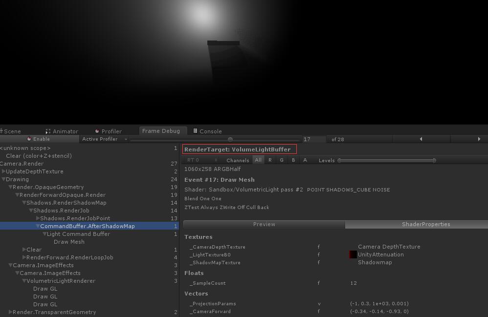 因此,Github 中的项目使用了 commandbuffer 在 Unity 渲染完 ShadowMap 后,绘制不透明物体之前绘制体积光的Sphere 并将rendertarget 设置为自定义的 rendertexture,最后再通过ImageEffect的方式,将体积光混合到当前的 framebuffer 中