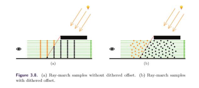 当然,上面提到的都是项目中比较基础的部分,Github 项目中还使用了 Deithered Offset 的方法来使 raytrace 的采样更加均匀,可以在使用更少的步数的情况下,达到更好的效果