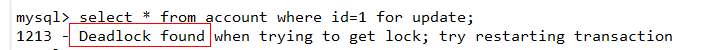 <d> 在 session2 中执行:select * from account where id=1 for update; 会产生死锁;