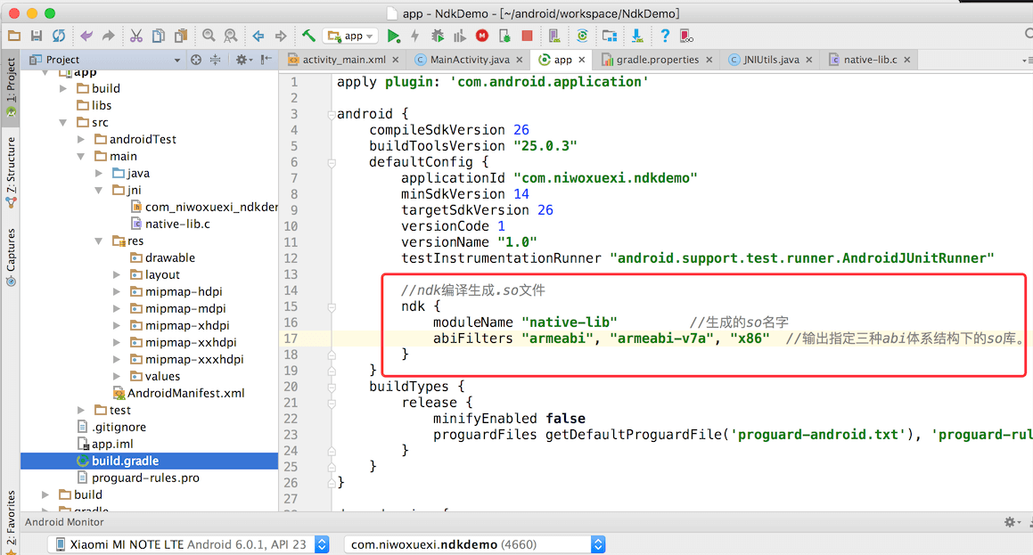 abiFilters "armeabi", "armeabi-v7a", "x86" //输出指定三种abi体系结构下的so库。
