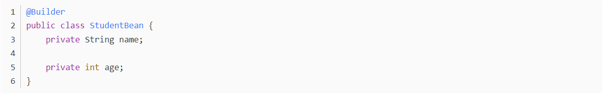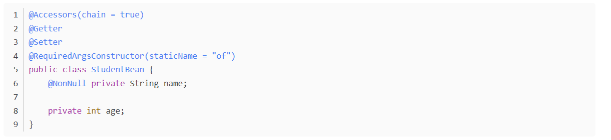 这样代码简洁多了 ,而且实现了链式编程,那如何用lombok实现一个静态的链式编程呢,再回过头来看刚刚的StudentBean,很多时候,我们去写StudentBean这个bean的时候,他会有一些必输字段,比如StudentBean中的name字段,一般处理的方式是将name字段包装成一个构造方法,只有传入name这样的构造方法,才能创建一个StudentBean对象。