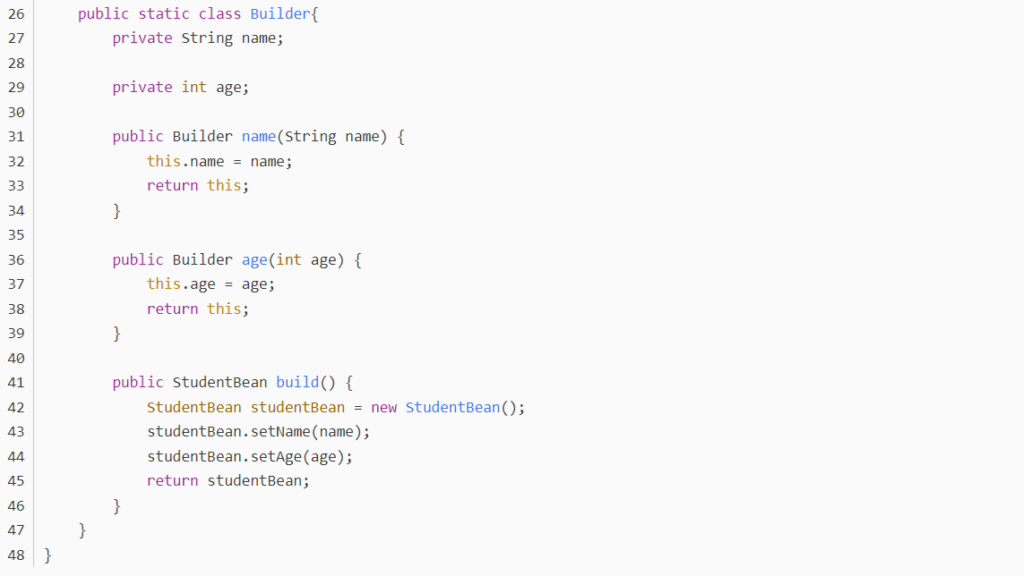 这样不仅实现了链式编程,还实现了静态创建,那么怎么实现一个builder模式的链式Bean呢,build模式实现原理为在bean里面创建一个静态builder方法和一个静态内部Builder类,通过调用静态builder方法来创建Builder类,然后通过builder类中的build方法直接创建一个Bean,具体如下: