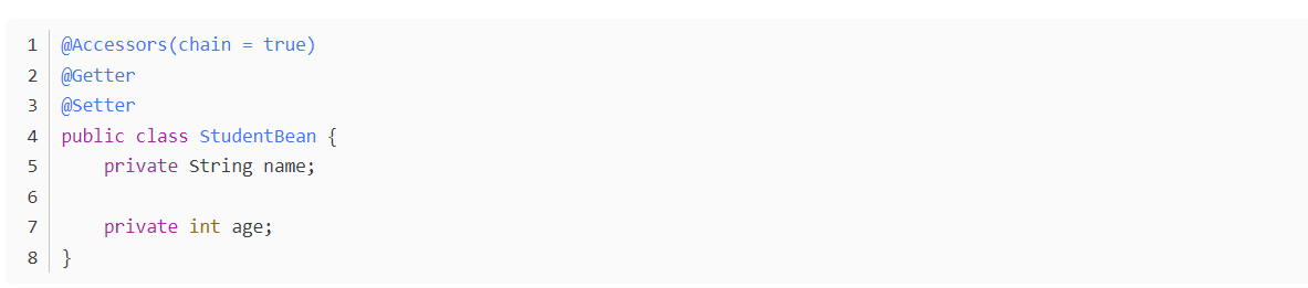 lombok其实已经提供该style,我们把这个bean改成lombok实现只需要加上一个@Accessors(chain = true)即可,如下: