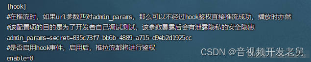 2.设置config.ini配置文件。如果不使用hook,不要开启,开启后所有推拉流都需要鉴权,会导致推拉流都报错权限不够。wvp只要连接了ZLMediaKit,就会修改配置文件开启hook。