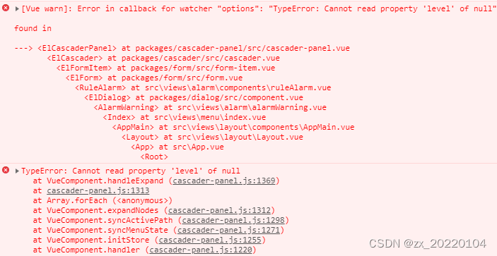 刚开始以为是后台返回的数据有问题,将后台返回的数组直接写死赋值给cascader就不会报错,只要数据写死就不会报错,动态赋值就报错。