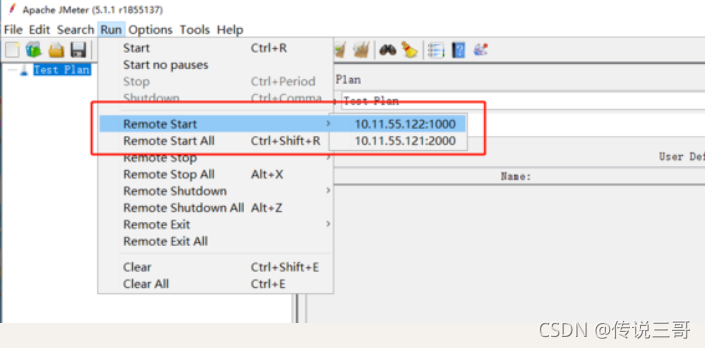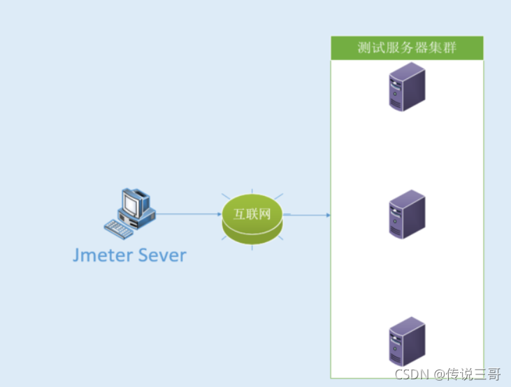 (4)有时候为了尽量模拟业务场景,需要模拟大量的并发请求,这个时候单台压力机就显得有心无力。针对这个情况,jmeter的解决方案是支持分布式压测,即将大量的模拟并发分配给多台压力机,来满足这种大流量的并发请求场景。