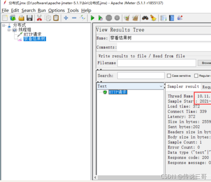 3、测试完成,可以在Contorller上的监听器里面看到Agent发来的测试结果,结果为多个Agent测试结果汇总而成;