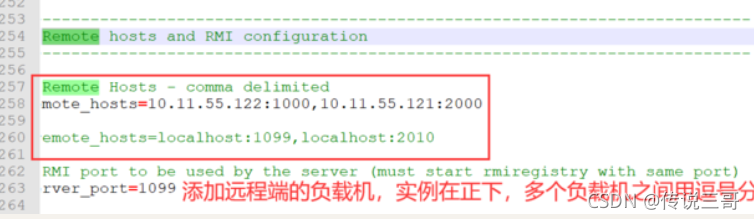 2.在调度机上修改JMETER_HOME/bin/jmeter.properties, 添加执行机的IP及端口 , 1099是默认的rmi通信端口。
