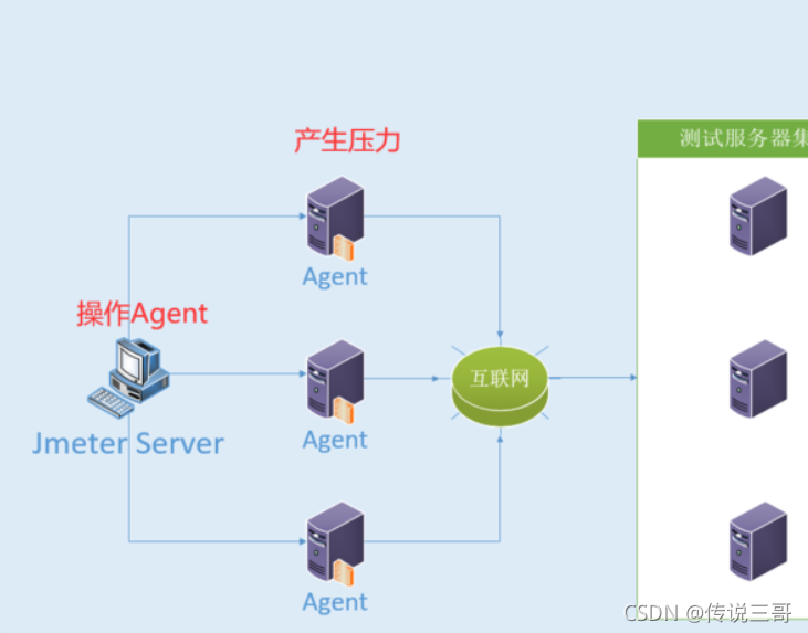 原理:比如我在jmeter server配置线程数为10,循环次数为100,也就是会对测试服务器发起1000次请求,我有3台agent服务器,如果我在server端选择远程启动压力测试,那么每台agent都会对测试服务器发起10*100次请求,那么这次压力测试产生的请求就是10*100*3=3000次。