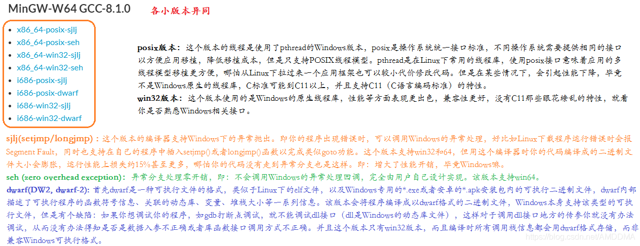 其中Windows下的gcc也有很多小版本,具体的含义如下,根据网上资料搜索并按照个人理解所言,难免有问题