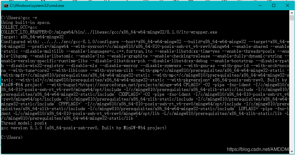 得到如下界面,即完成gcc的Windows安装,今后可以在Windows的命令行直接编译代码了,最简单的命令:gcc test.c