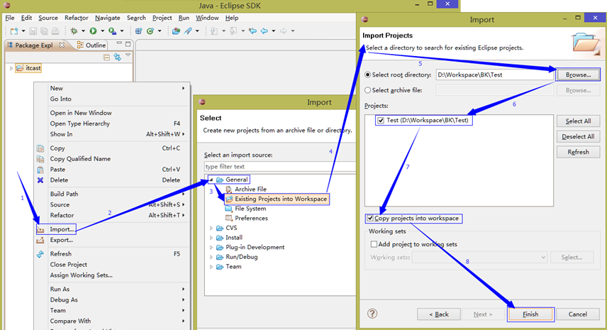 在新的窗口中,点击 Browse 找到需要导入的项目(注意,找到项目的名字位置就可以了),选中要导入的项目,点击Copy复选框,点击Finish完成。