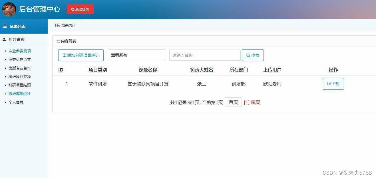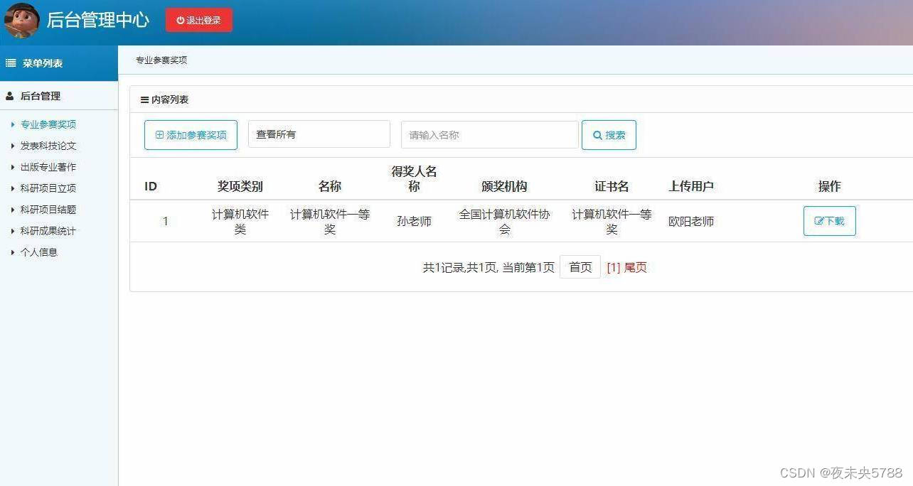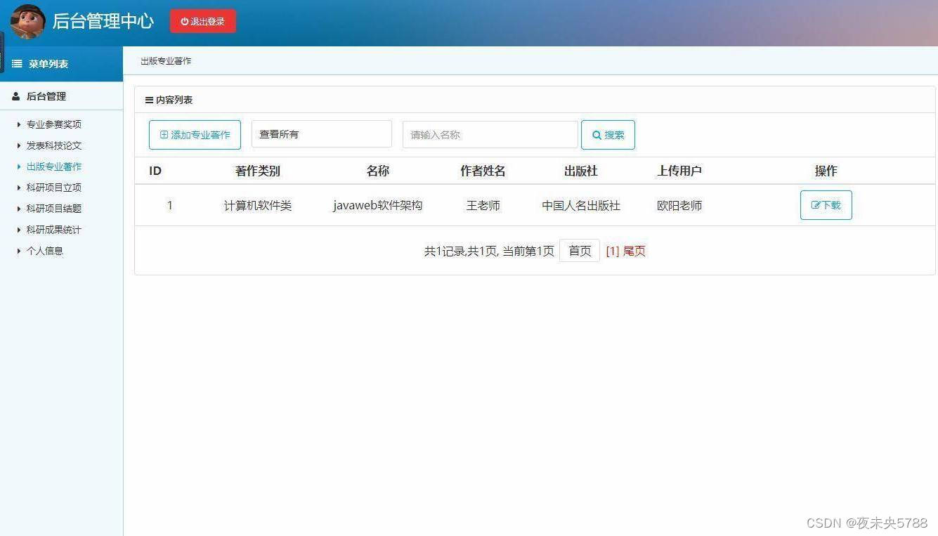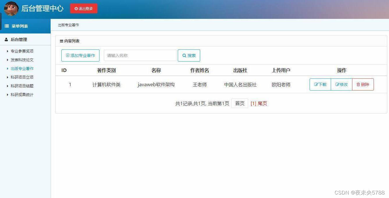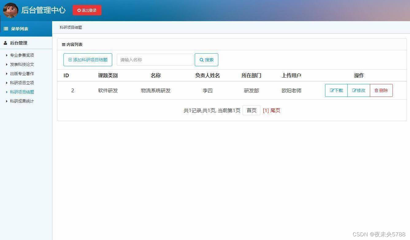 登录,专业参赛奖项管理,科技论文发表管理,出版专业著作管理,科研项目立项管理,科研项目结题管理,科研成果统计管理等功能。