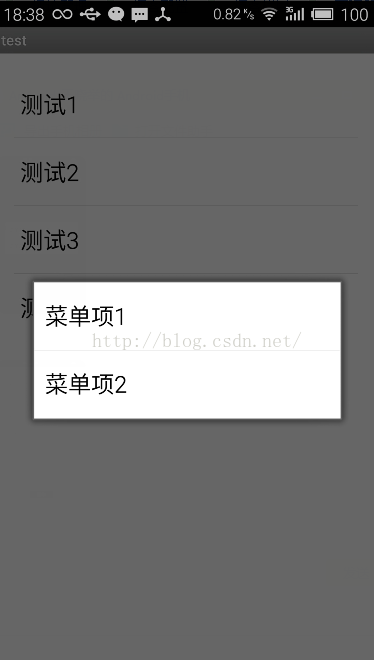 长按测试2,显示上下文菜单,再点击菜单项1,显示一个吐司,效果如下