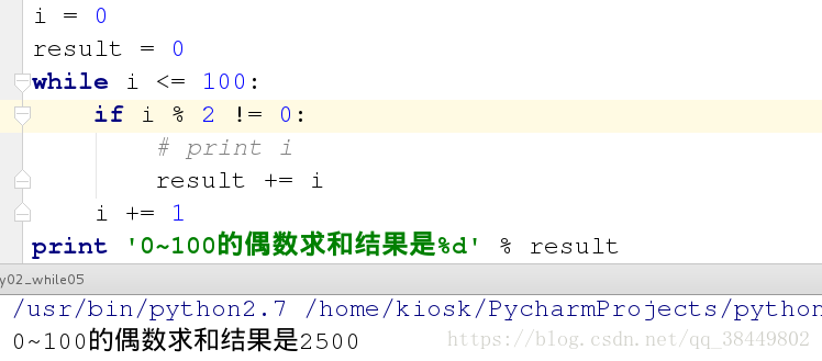 print '0~100之间的奇数累加的结果是 %d' %result