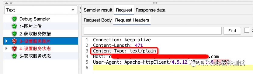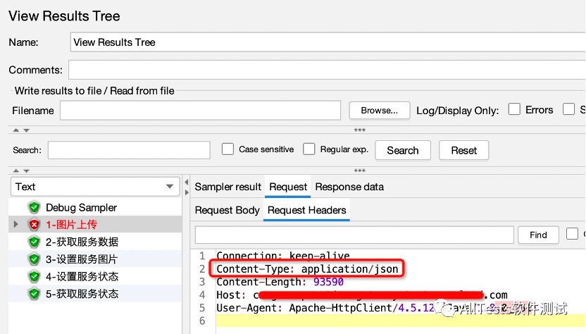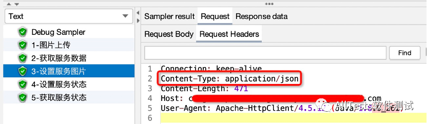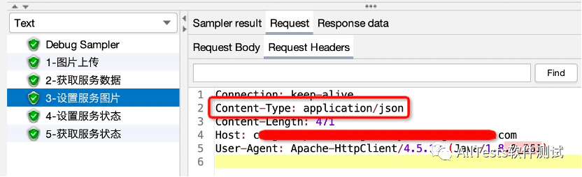 “3-设置服务图片”、“4-设置服务状态”接口需要添加请求头(Content-Type: application/json),所以在这两个接口下添加HTTP信息头管理器即可。