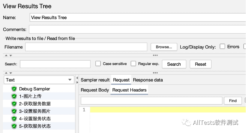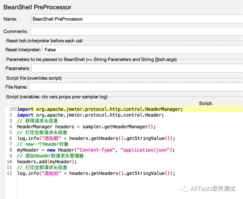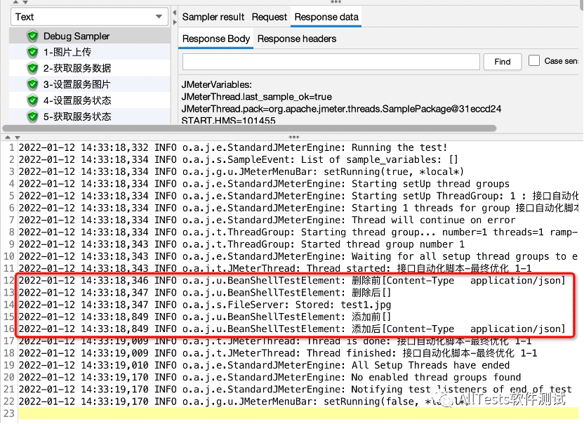 因为“1-图片上传”接口不需要公共信息头里的请求头信息,所以添加BeanShell PreProcessor前置处理器,删除公共请求头里的信息。