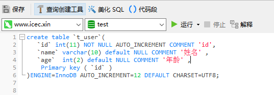 首先,在数据库Mysql中创建一个数据库和一张表,数据库的名称为test,创建好数据库后进入数据库,“新建查询”界面输入以下脚本内容创建一张t_user表。