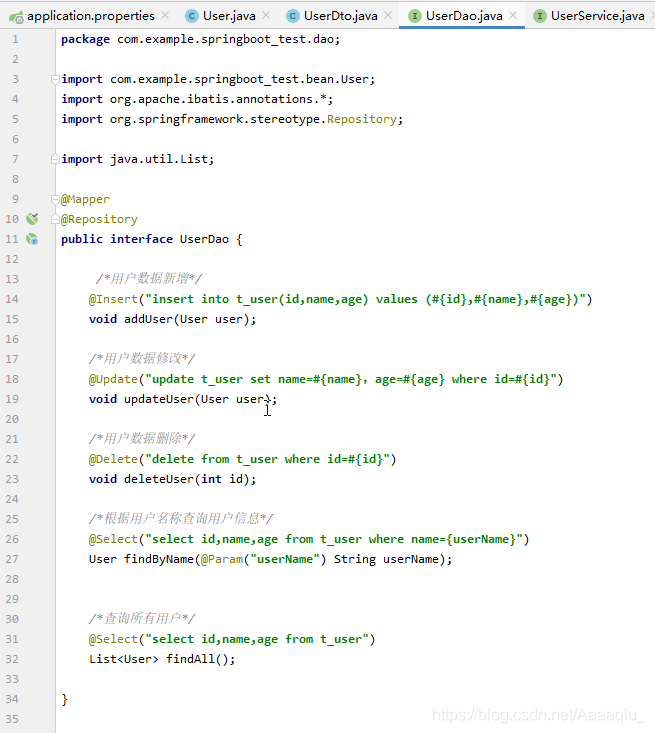 第二种是使用注解,@Insert、@Select、@Update、@Delete这些来完成(本次使用这一种)