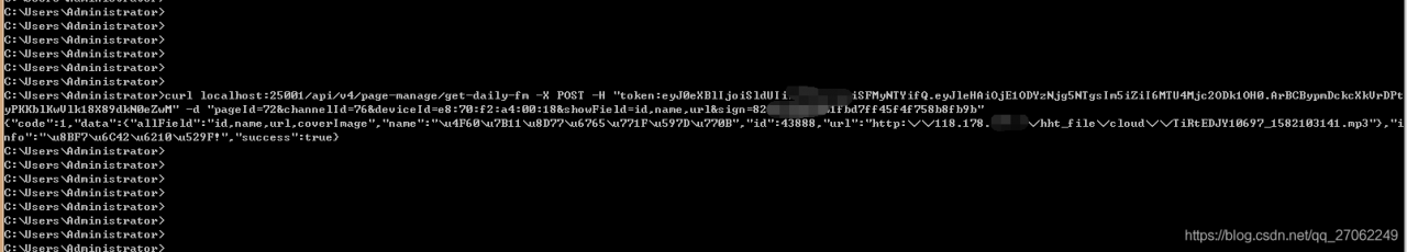 {"code":1,"data":{"allField":"id,name,url,coverImage","name":"\u4F60\u7B11\u8D77\u6765\u771F\u597D\u770B","id":43888,"url":"http:\/\/118.178.000.0\/hht_file\/cloud\/\/TiRtEDJY10697_1582103141.mp3"},"info":"\u8BF7\u6C42\u6210\u529F!","success":true}2.2 我自己用curl请求数据发现得到的数据编码的unicode格式的。见图: