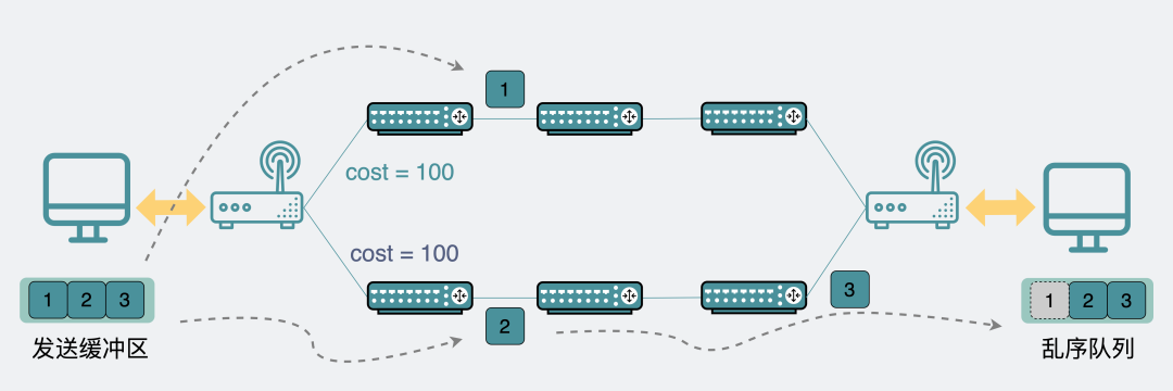 现在两个数据包走两条路径,先发的数据包可能后到。这就乱序了。