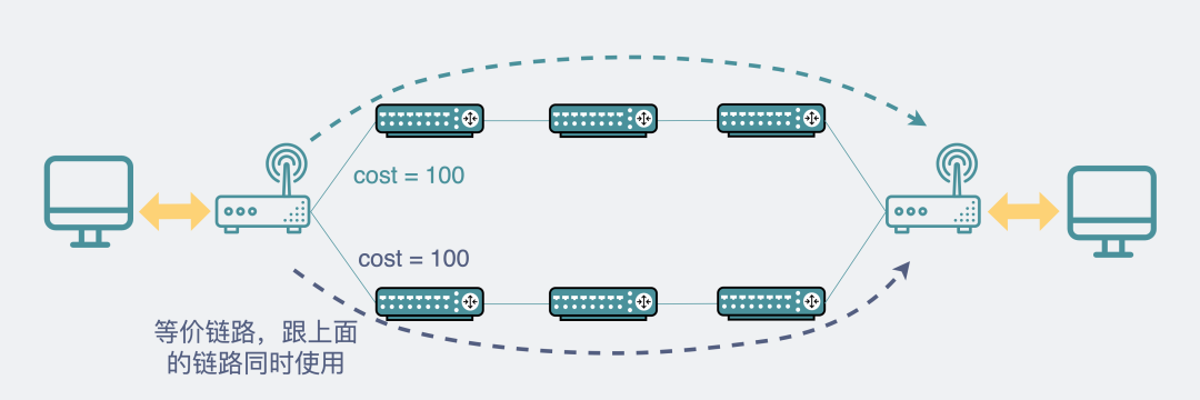 这也就是所谓的等价多路径,ECMP(Equal Cost MultiPath)。