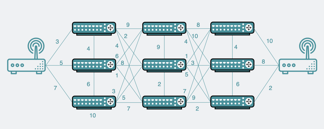 在上面的那么大一张网络中,随便一个路由器都有可能走任何一个路径,将数据发到另外一个路由器上,