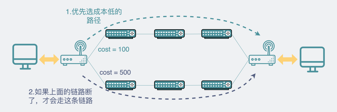 从A点到B点,如果这两条路径成本不同,带宽都是1千兆。那数据包肯定就选成本低的那条路了,如果这条路出故障了,就走下面那条路。但不管怎么样,同一时间,只用到了一条路径。另外一条闲置就有些浪费了,有没有办法可以利用起来呢?