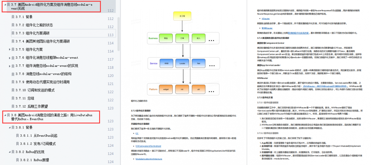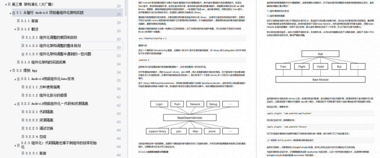 这里给大家分享一份全网最全的《高级 Android 组件化强化实战》手册,手册分为三个大章节,Android 组件化初识,Android 组件化初探 和 架构演化(大厂篇),最主要的就是第三个章节——架构演化(大厂篇)。