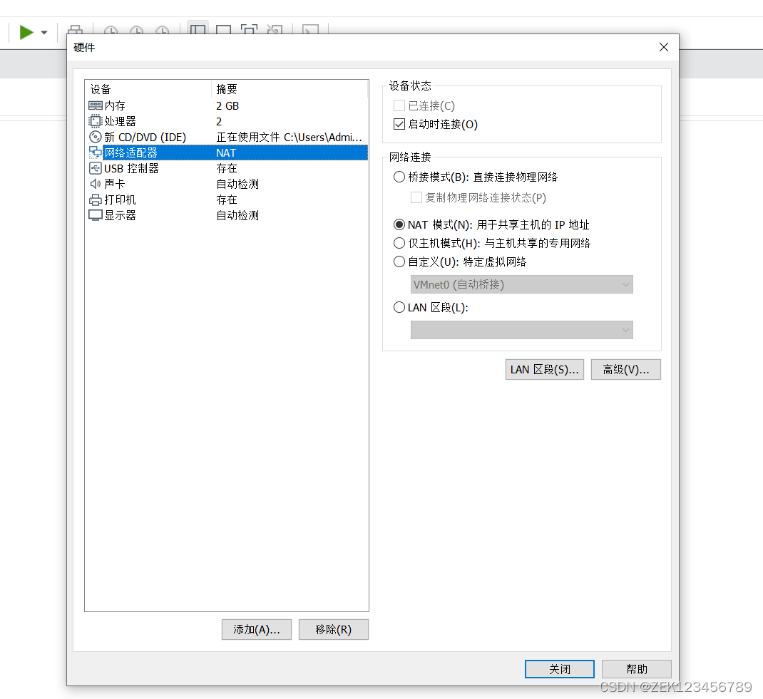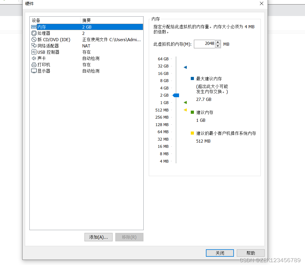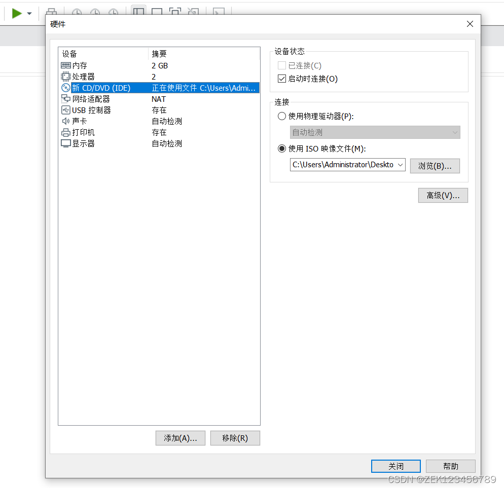 8、进入 自定义硬件 页面,除了 新CD/DVD这一栏,其他的都可以根据自己需求调节,但是内存一定要大于2G,点击新CD/DVD,选自ISO映像文件(可在如下地址下载映像文件:https://archive.kernel.org/centos-vault/6.1/isos/x86_64/),关闭: