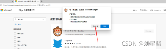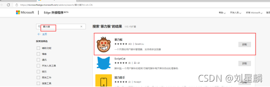第三步: 输入 暴力猴 点击搜索 选择之后 点击 获取 弹出框 选择 添加扩展