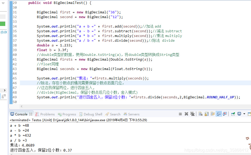 Java在java.math包中提供的API类BigDecimal,用来对超过16位有效位的数进行精确的运算。双精度浮点型变量double可以处理16位有效数。在实际应用中,需要对更大或者更小的数进行运算和处理。float和double只能用来做科学计算或者是工程计算,在商业计算中要用java.math.BigDecimal。BigDecimal所创建的是对象,我们不能使用传统的+、-、*、/等算术运算符直接对其对象进行数学运算,而必须调用其相对应的方法。方法中的参数也必须是BigDecimal的对象。构造器是类的特殊方法,专门用来创建对象,特别是带有参数的对象。