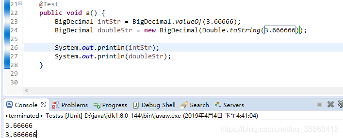 当double必须用作BigDecimal的源时,请使用Double.toString(double)转成String,然后使用String构造方法,或使用BigDecimal的静态方法valueOf,如下