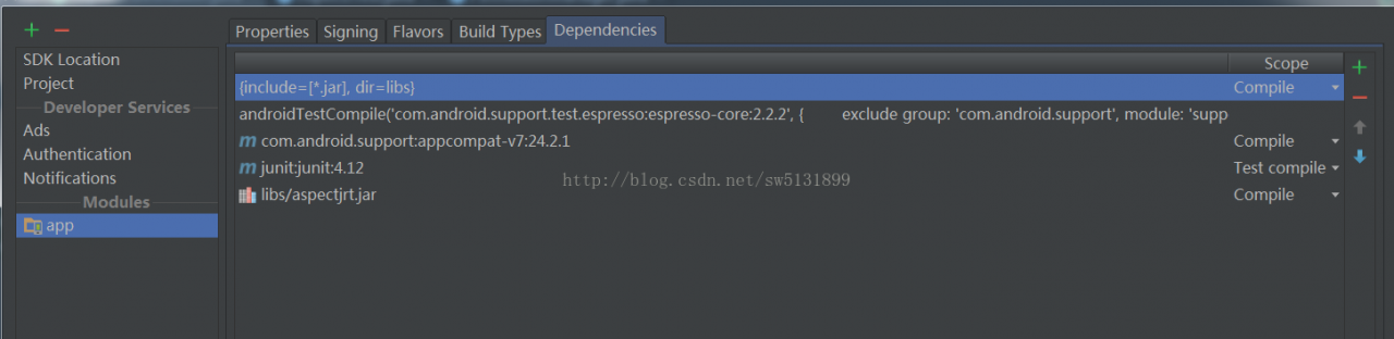 至于为什么这么配置,AspectJ是对java的扩展,而且是完全兼容java的。但是编译时得用Aspect专门的编译器,这里的配置就是使用Aspect的编译器。这里还在libs导入了一个jar包。创建依赖。
