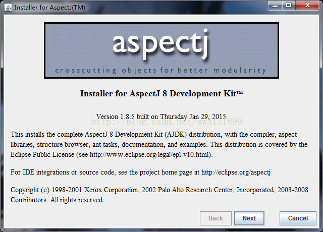 那么先从搭环境开始吧,待会会把aspectJ的jar包放在git上,下载1.8.5.jar包之后,安装在电脑上。直接点安装即可。