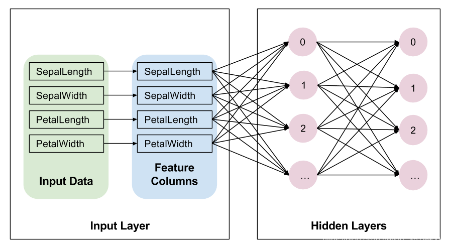 让我们看看如何使用自定义Estimator解决Iris问题。 快速提醒 - 这是我们试图模仿的Iris模型的组织结构: