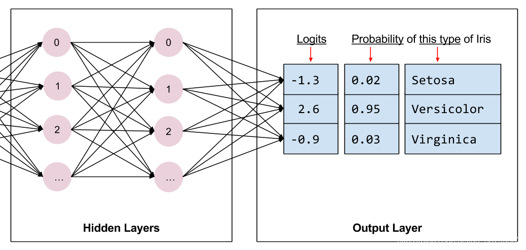 定义输出层时,units参数指定输出的神经元数量。 因此,通过将units设置为params [‘n_classes’],模型会为每个分类生成一个输出值。 输出向量的每个元素将包含分别针对Iris的相关类别计算的分数或“logit”:Setosa,Versicolor或Virginica。