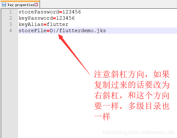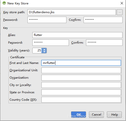 看到我在 D盘的根目录创建了一个 flutterdemo.jks 的签名,Alias(别名)是flutter,密码都是123456,这里的别名和路径最好不要有中文,否则出现“???”的未知错误。