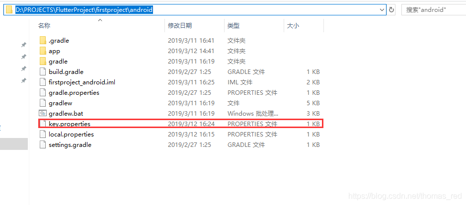 在工程目录下的android的目录下,创建一个空文本txt,然后把文件名改为 key.properties(文件名可以随意)