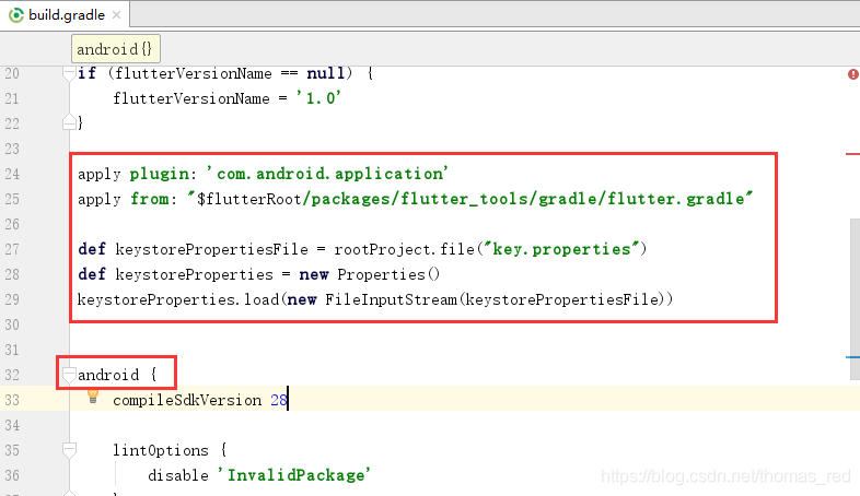 找到app下的build.gradle,找到android节点,在上面添加一段代码,就是打开刚刚你创建的空白的签名配置文件:key.propertis