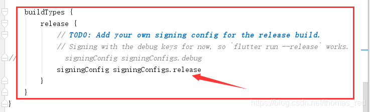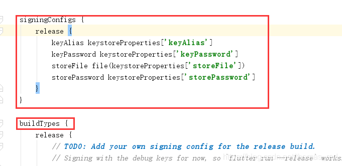keystoreProperties.load(new FileInputStream(keystorePropertiesFile))找到buildTypes节点,在上面添加一段signingConfigs配置,如下图: