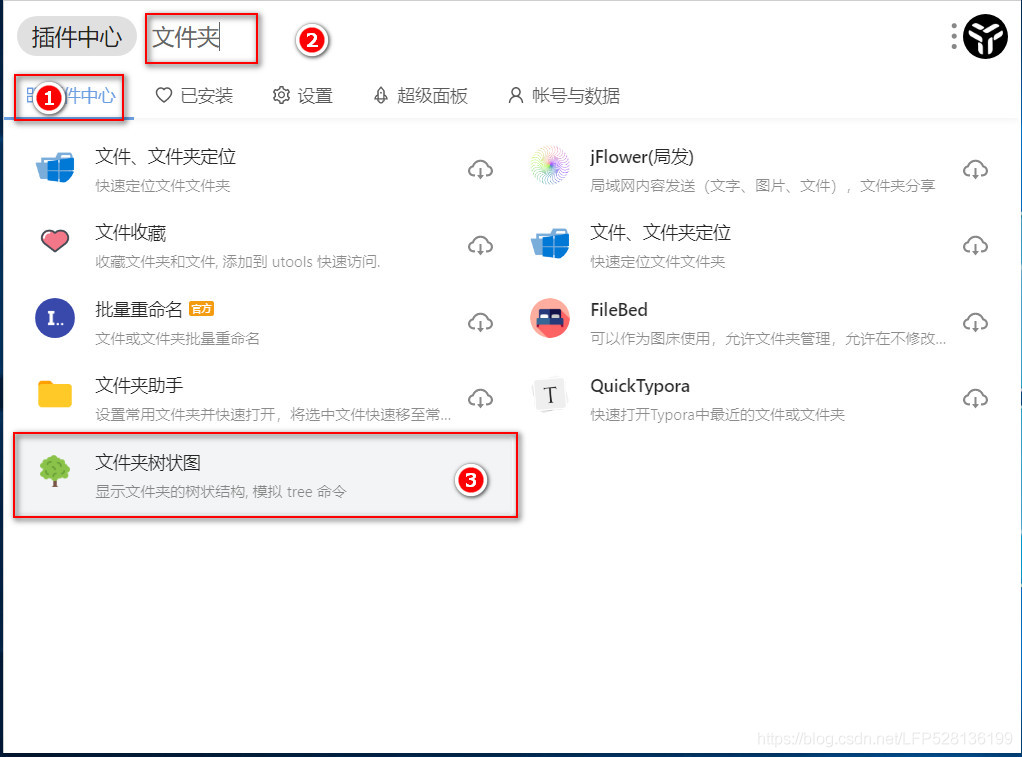 安装并启动utools工具。在插件中心搜索“文件夹”,然后安装序号③所示插件。