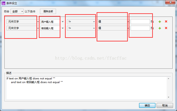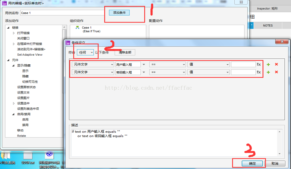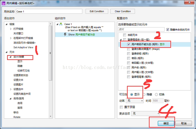 接下来,再添加一个条件,只要判断到用户名,密码输入框有一个是空的,则显示警告语。步骤为:选中登录按钮-->再次双击“鼠标单击时”再添加一个新的用例,在弹出的窗口中选中“添加条件”