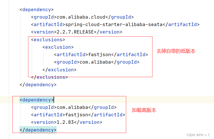 - 但是由于fastJson1.2.83以下的版本有安全漏洞,所以我们需要将seata中的fastJson进行升级,我们只需要将这个低版本的去掉,然后引入一个高版本的即可